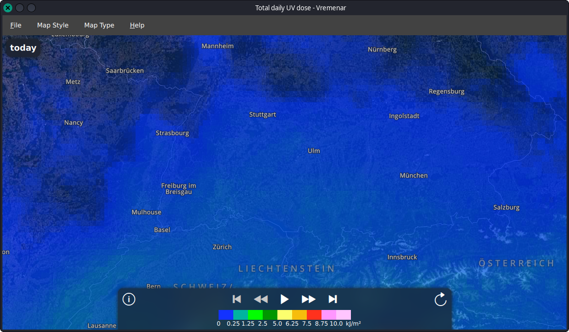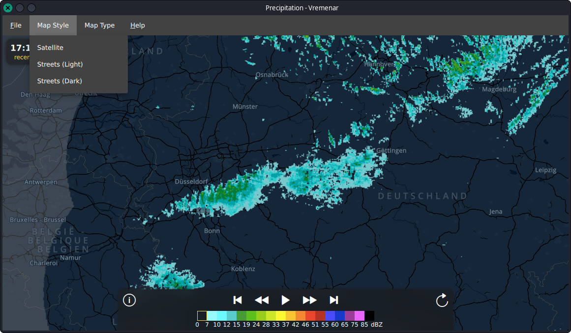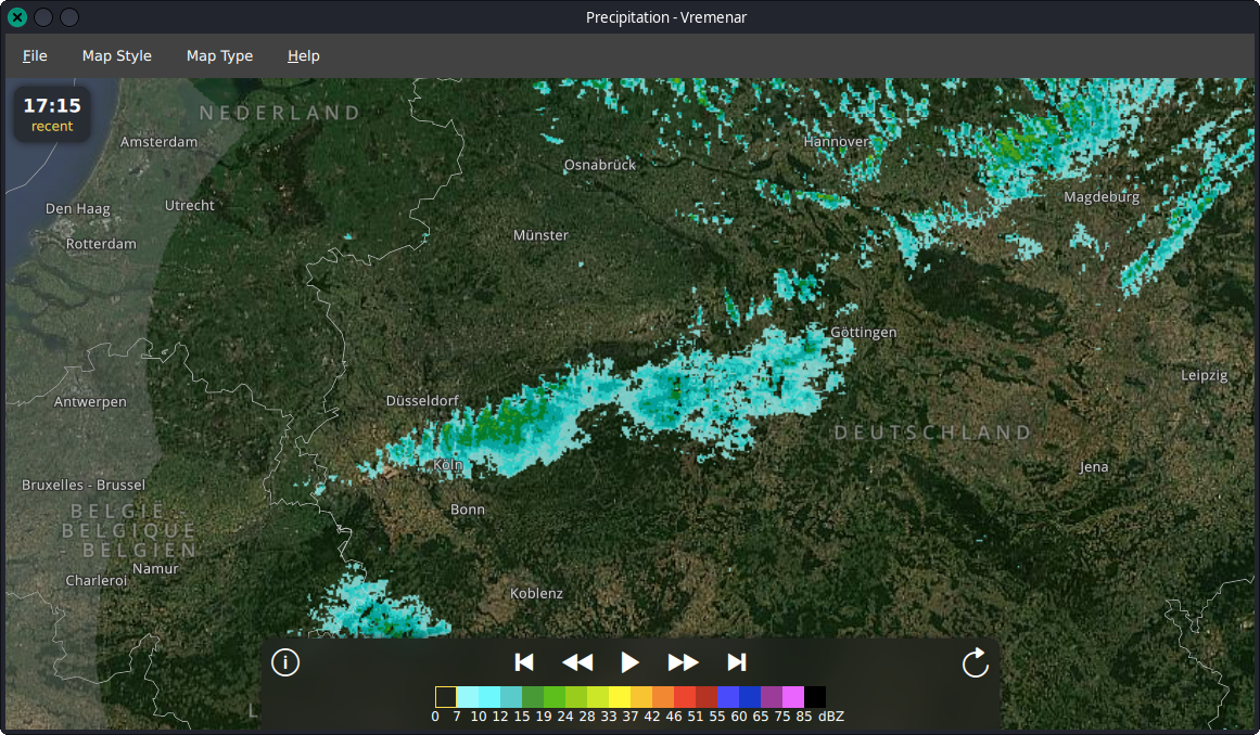 Display weather conditions and forecast on a map in a quick and simple way. Choose between general condition, precipitation radar, cloud cover, wind speed, temperature and hail probability maps (not all supported with all providers). The app also shows the weather at your current location.