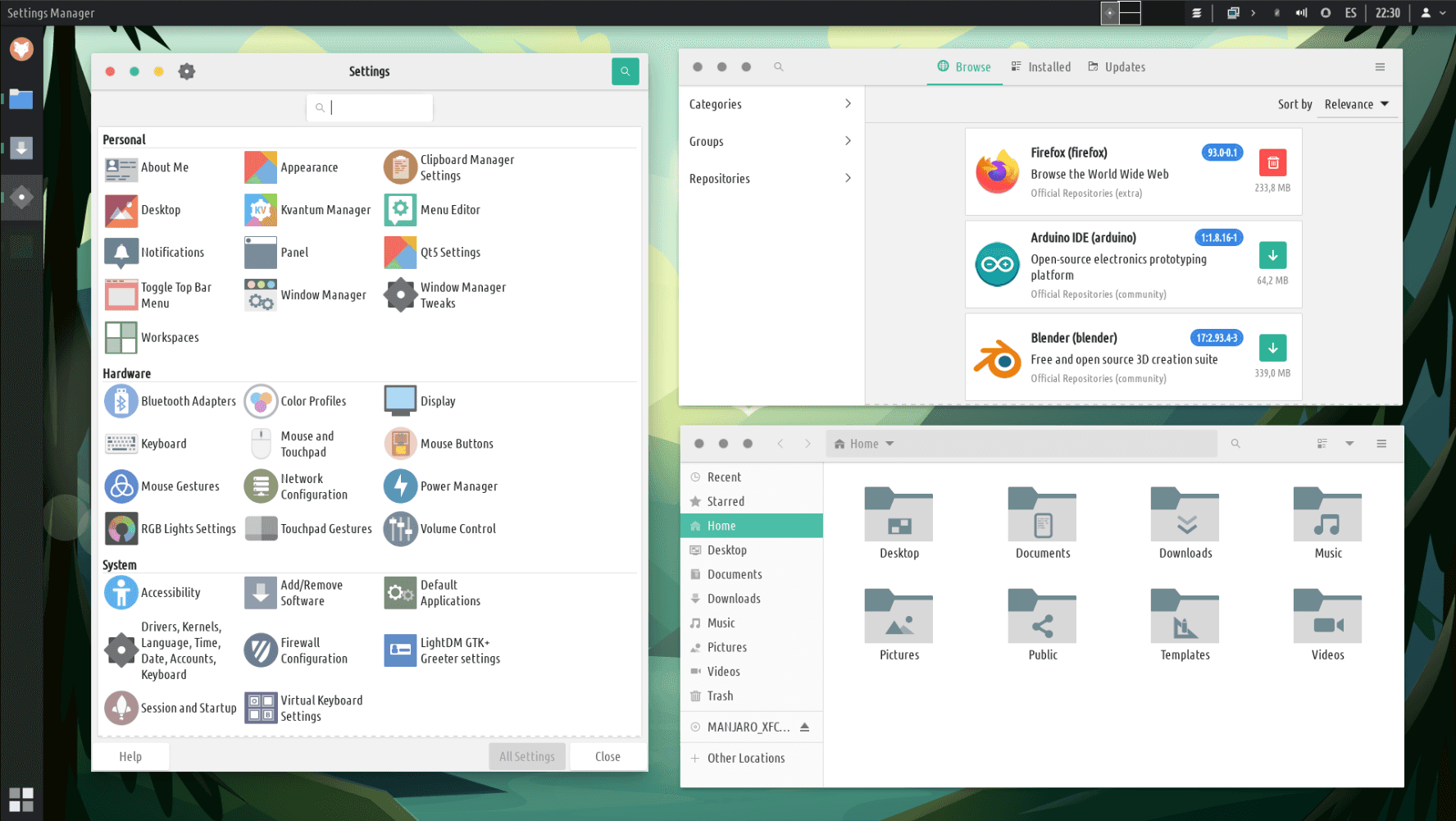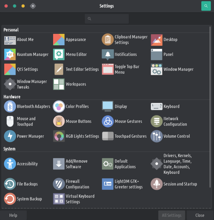 There is one single settings manager to rule them all! And we've added plenty of options to it. Change the theme, icons, cursor; tweak the touchscreen/touchpad gestures, map your mouse buttons or change the mouse gestures. And if your hardware is supported you can even tweak the RGB lights for your keyboard/mouse.