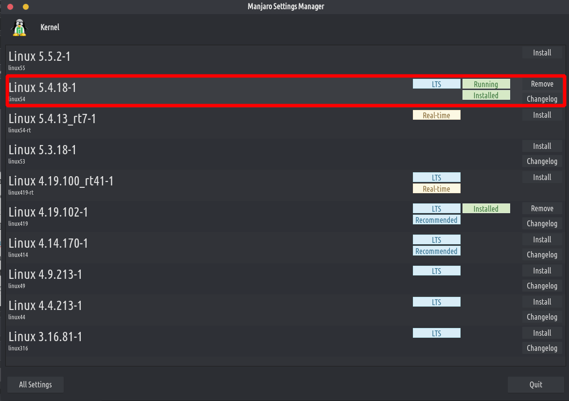. - Oerskeakele nei de nije Kernel 5.4 LTS. Dit is in Long Time Support kernel (LTS). It is in seldsum barren dat elke pear jier bart. Wy riede oan dat âlde TROM-Jaro-brûkers bywurkje nei de nije kernel. It is hiel maklik. Ynstallearje manjaro-settings-manager (in oar nij pakket dat wy tafoege hawwe oan dizze nije ISO). Iepenje it. Gean nei 'kernel'. Doe, wêr't it kernel 5.4 seit, 1,00) LTS, klikje op Ynstallearje.