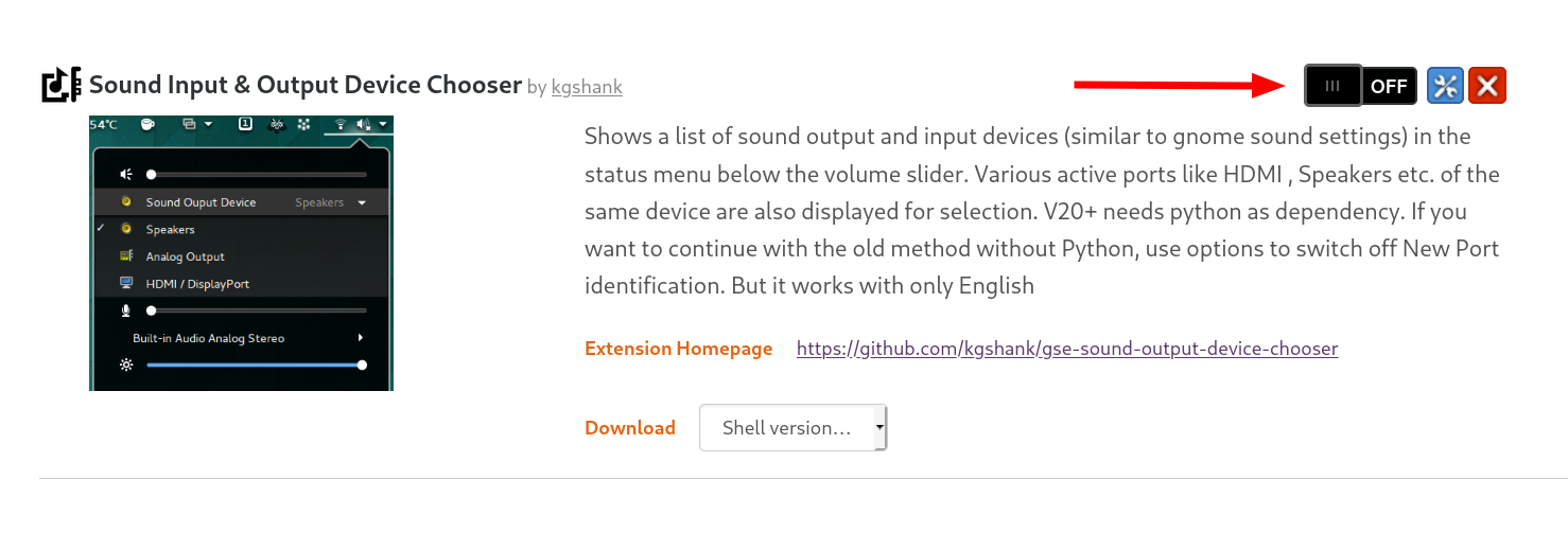 . - Wy tafoege a Sound Switcher Gnome-útwreiding, sadat it makliker is om de lûdútfier (sprekkers / koptelefoan) en lûdynput (mikrofoan) direkt fan 'e rjochter boppeste balke te feroarjen. Foarige TROM-Jaro-brûkers kinne op de boppesteande URL klikke en it dan ynskeakelje.