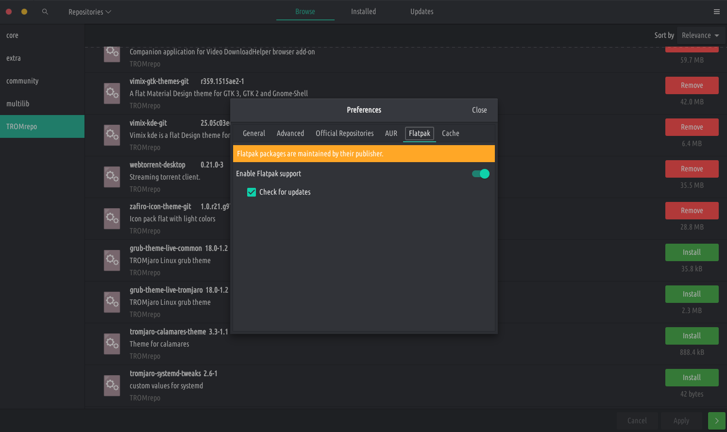 - Wy hawwe flatpak-stipe ynskeakele yn software tafoegje / fuortsmite. Dit iepenet mear applikaasjes yn it softwaresintrum. Ynstallearje it hjirwei pamac-flatpak-plugin as jo al TROMjaro. Wy riede jo tige oan om it te ynstallearjen, om't wy gau brûkers kinne tastean flatpak-applikaasjes direkt út ús app-bibleteek te ynstallearjen, dus jo hawwe dit pakket nedich. Wy hawwe it ek standert ynskeakele yn 'e nije TROMjaro-release. Om it manuell yn te skeakeljen, gean nei Software taheakje / fuortsmite, klikje op it Menu-ikoan en dan Foarkarren. Foegje jo wachtwurd ta en navigearje dan nei it ljepblêd Flatpak. Aktivearje it as sadanich.