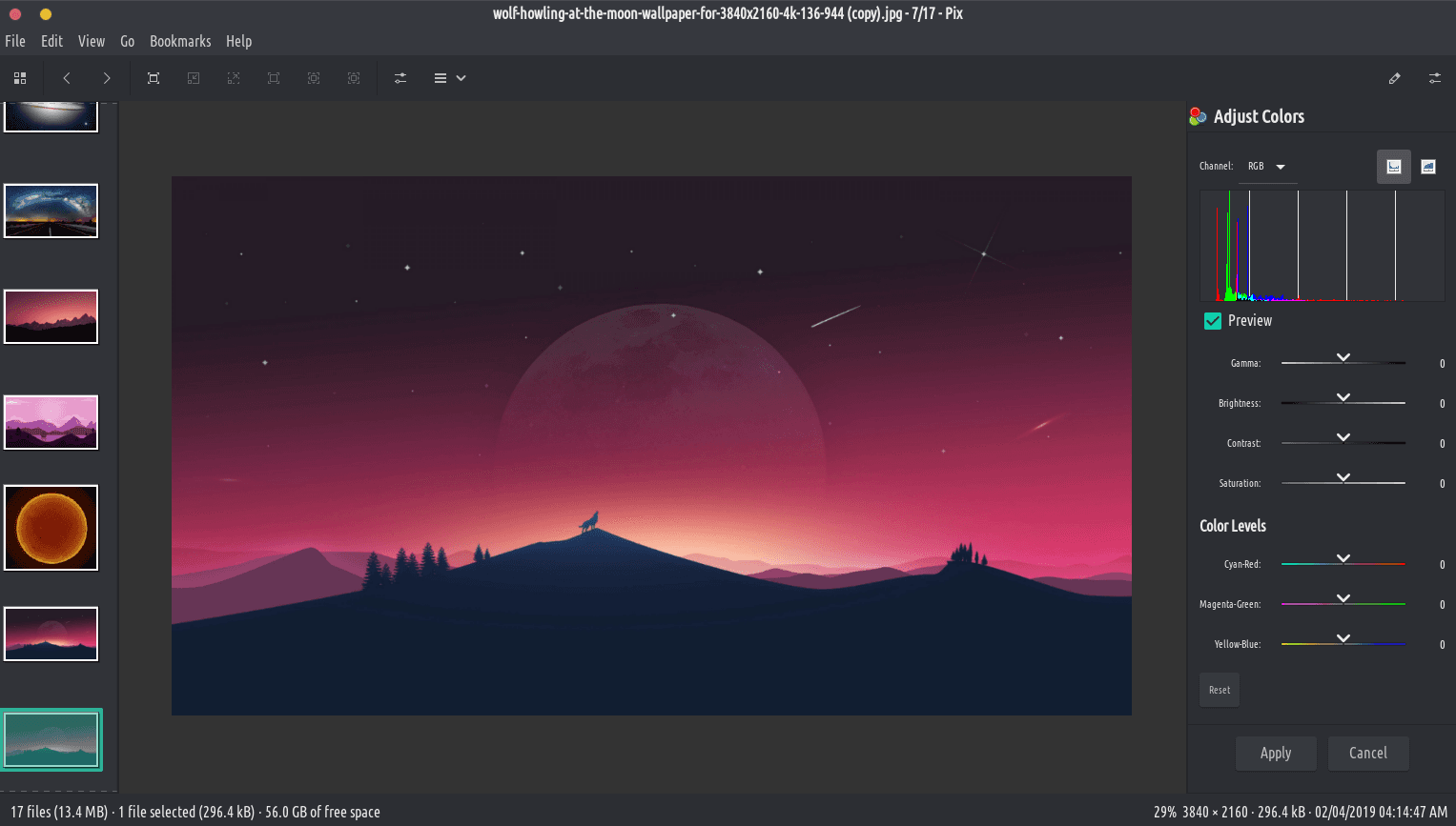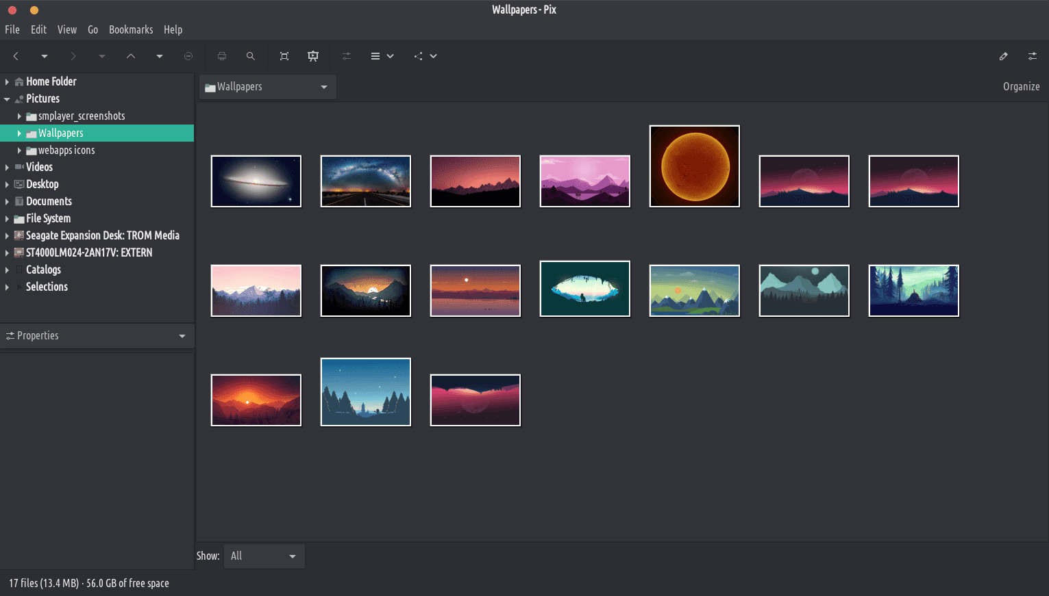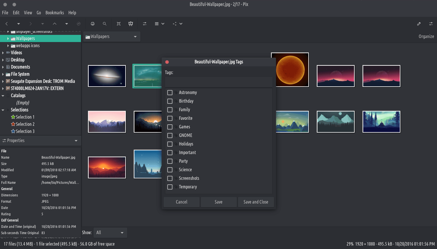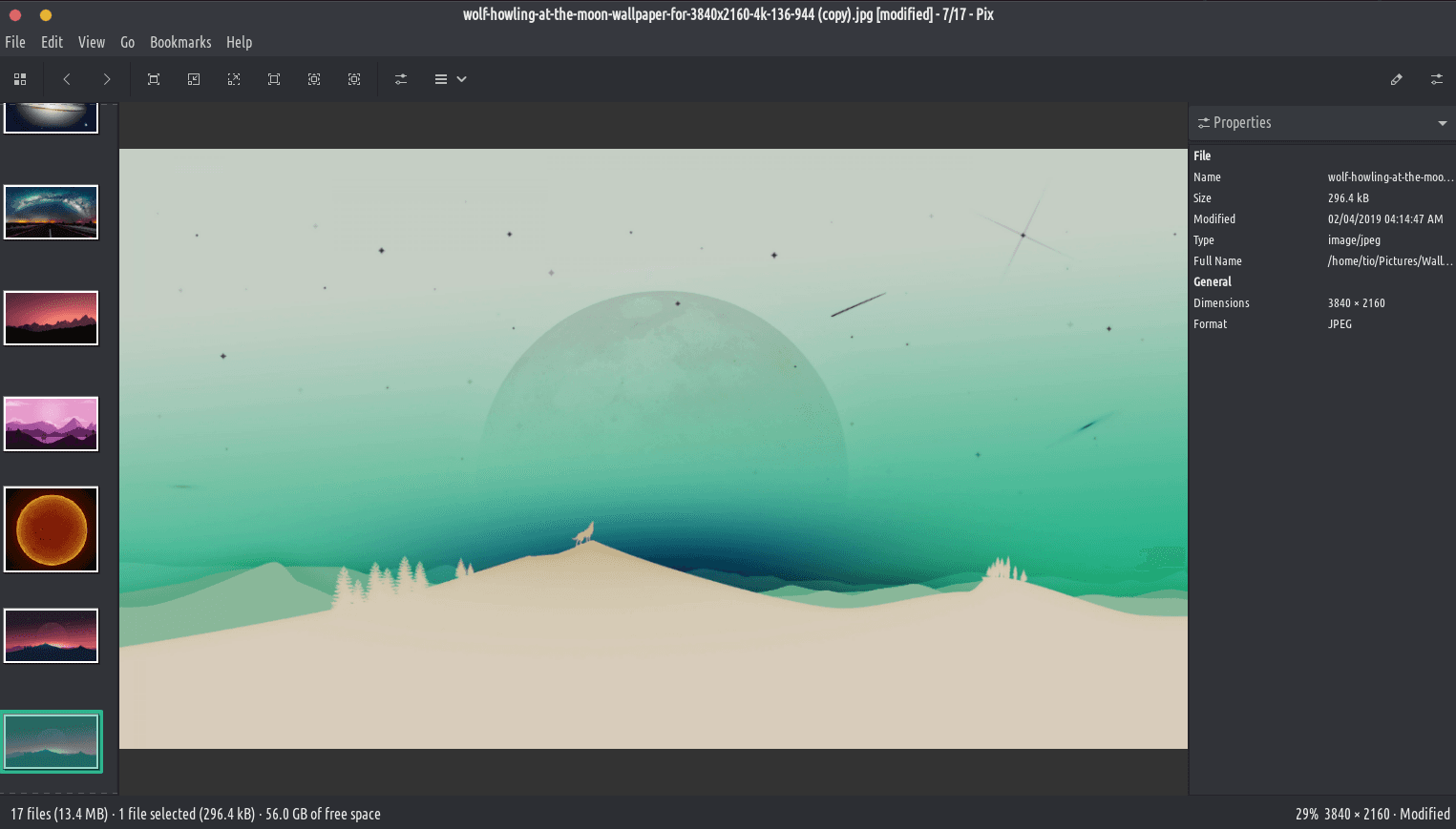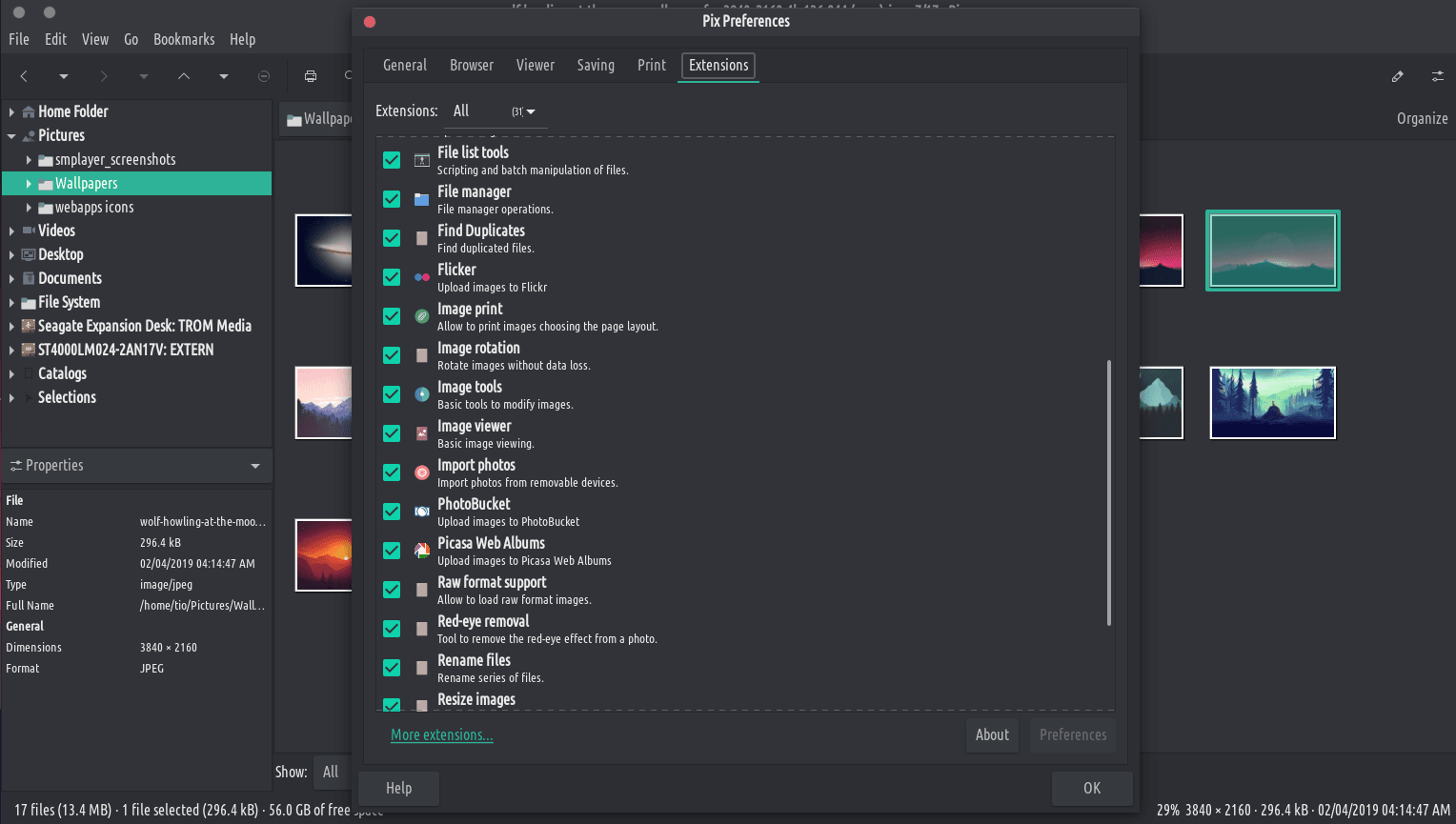 The Pix image gallery is ideal for browsing and displaying a collection of images. Pix integrates with the look and feel of Plasma and supports many image formats for viewing single images or images in a folder. It also displays the metadata of the image files.