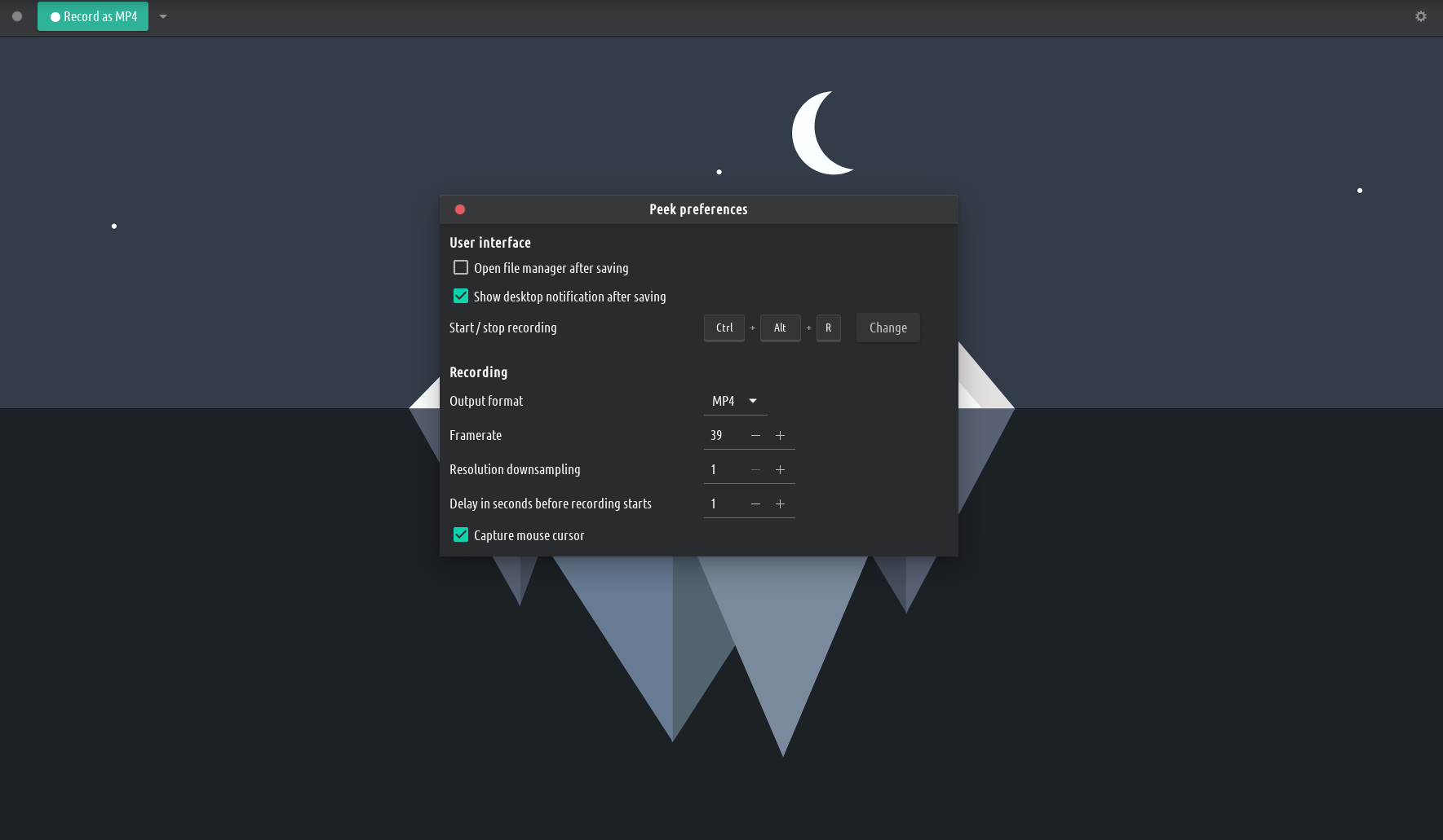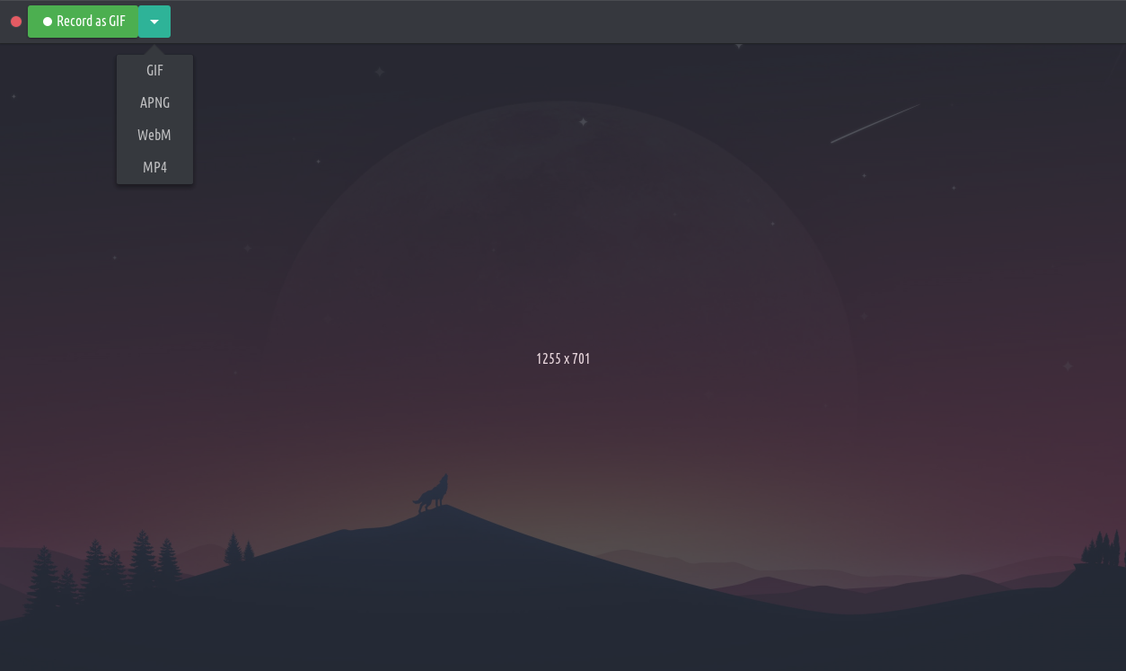 Peek is not a general purpose screencast app with extended features but rather focuses on the single task of creating small, silent screencasts of an area of the screen for creating GIF animations or silent WebM or MP4 videos.